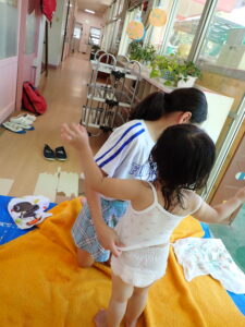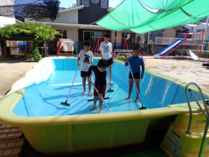 この夏も、中野児童クラブ学童のお兄さんお姉さんが大活躍!保育所の子どもたちを着替えさせてくれたり、お昼寝の寝かしつけにきてくれ                          たりいつもプールをピカピカにしてくれてありがとう♪ 夏祭りも招待してくれて、保育所のみんな嬉しかったよ!