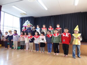 12月13日(土)生活発表会がありました。この写真は練習の一コマ。背景や衣装を手作りしたり、セリフを覚えたたり準備を進めてきました。今年は得意なことを披露するクラスが多く、1歳児から年長児まで2クラスずつ入れ替えで保護者の方、兄弟、祖父母の方が見に来ていただき多くの拍手をいただき子どもたちも恥ずかしさもありながら嬉しそうな表情でした♪