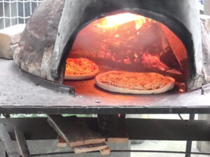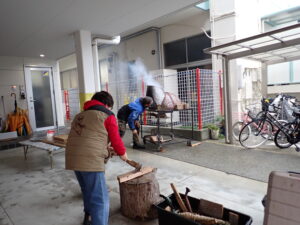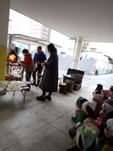 天候に恵まれず、急遽駐車場に移動してでのピザづくり☆芸術士のルカさんは、毎年、火が大切なものと危険なものという二つの顔を持つことを子どもたちに教えに来てくれます。